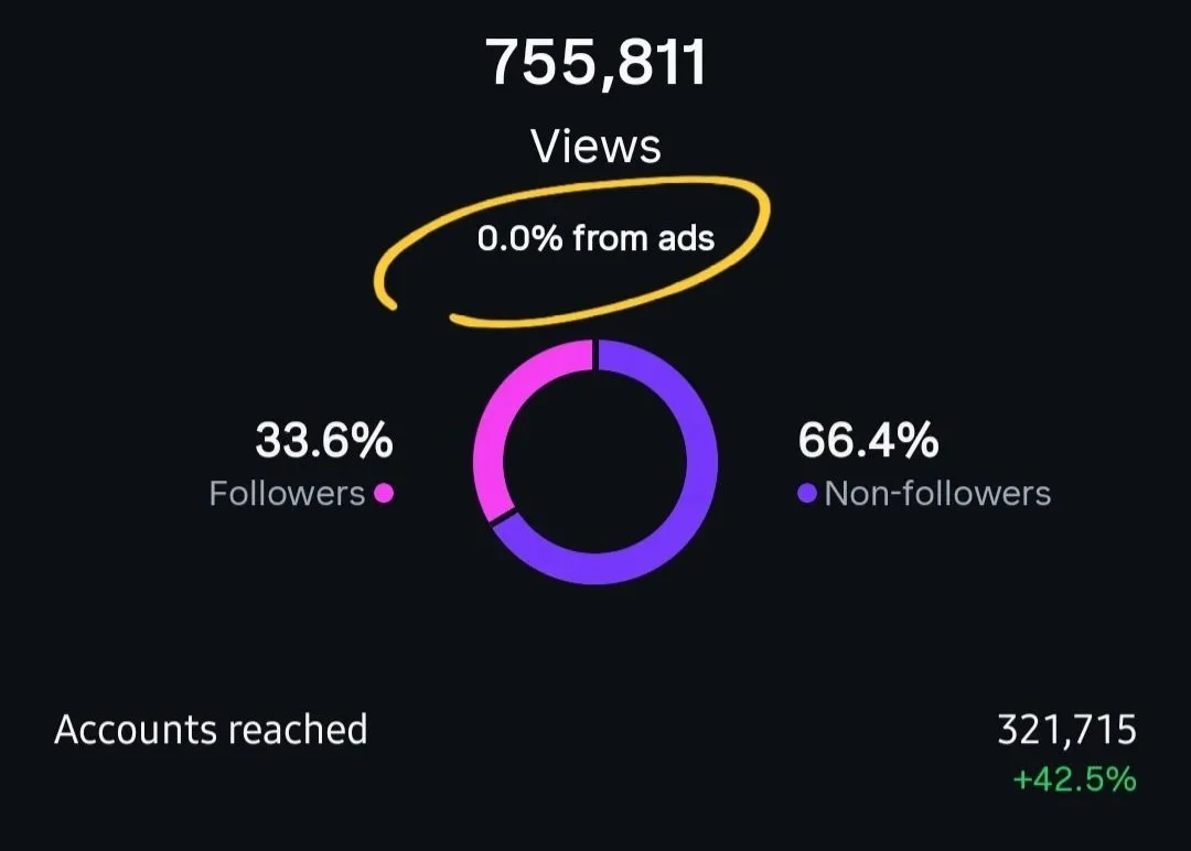 Just take a look at my recent results (which are standard - I didn’t have any crazy viral posts during this time!). Over 700,000 views in 48 days and 321,000 people reached, without spending a penny on ads.